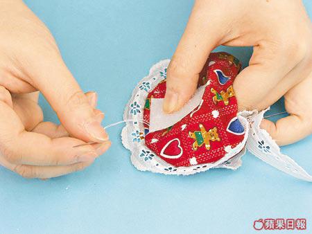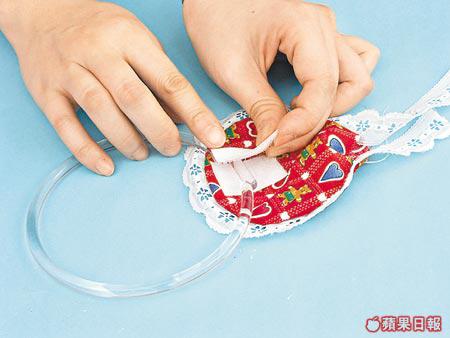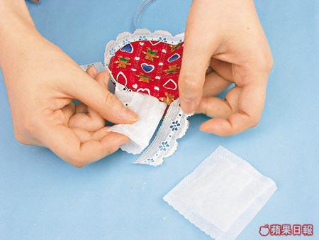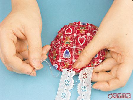 縫合圓形布袋時所預留的開口,是方便更換吸濕珠;每當放進吸濕珠後,便可將花邊綁好,然後打結掛在掛勾上。