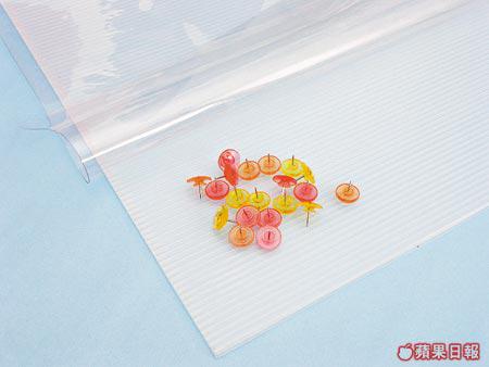 㩒釘2盒$32、塑膠瓦通板1塊$38、透明膠片1碼$18