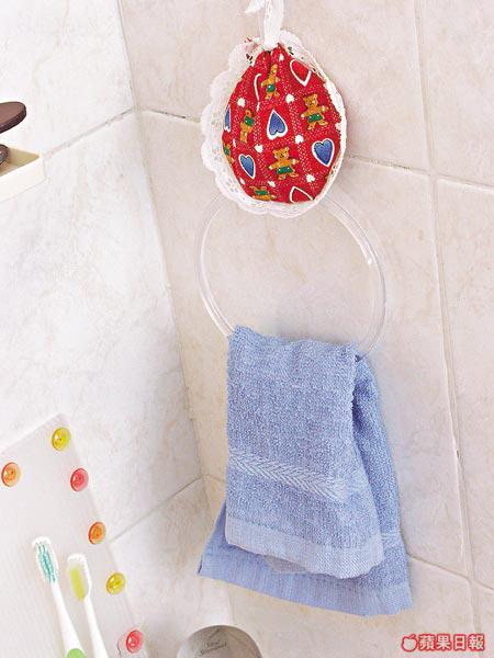 浴室濕氣重,除了勤加抹拭及留有通風位外,擺放吸濕用品亦有助室內保持乾爽。而毛巾架上的小布袋,正好用來放置小包裝的吸濕珠,變成既美觀又實用的防潮用品。