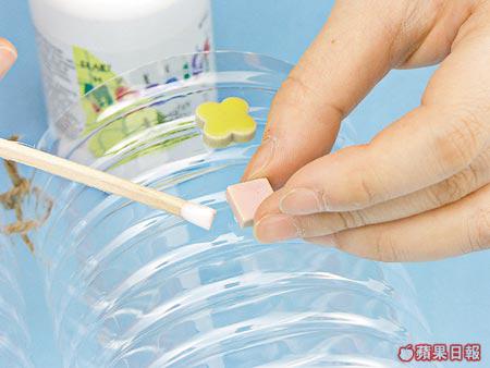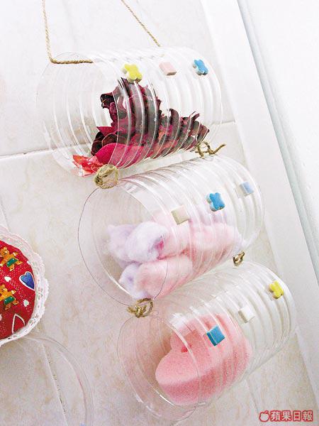 深明膠樽是循環再用的好素材,尤其適用於濕𣲷𣲷的浴室,而一個3樽相連的雜物掛架絕對是個不錯的設計,加上以小瓷磚來裝飾,與浴室環境就非常合襯。一層層將棉花球、浴綿等雜物分類擺放更見歸一,記得預留一層用來放置乾花,這便滿室香氣。