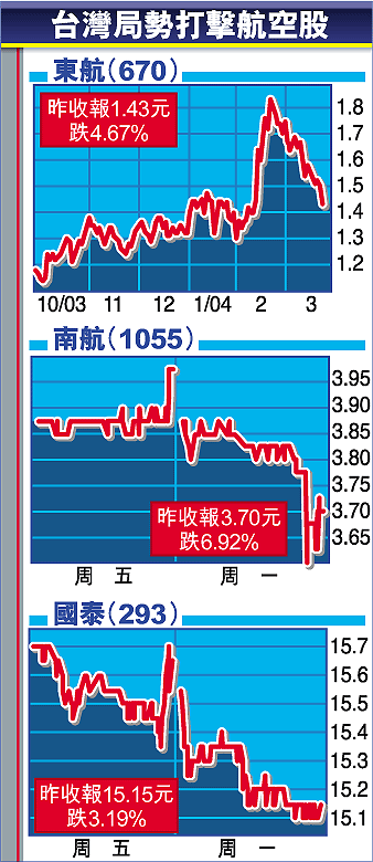 市場憂慮台灣總統選舉結果有變或政局不穩,令最受到影響的航空股急跌,南方航空(1055)跌幅較大,挫近7%;國泰航空(293)也跌3.19%。藍籌股當中,電訊股沽壓較重,和黃(013)跌3.9%、中移動(941)跌3%。地產股以長實(001)跌幅較大,挫近3.76%;恒基地產(012)及新鴻基地產(016)同樣跌2.4%。
