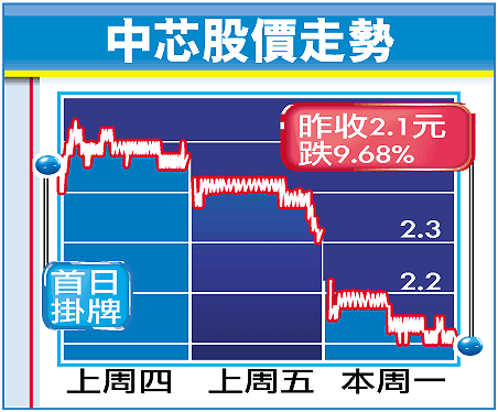【本報訊】中芯國際(981)受台晶片股急挫拖累,昨再跌9.7%,收2.1元(圖)。證券業人士指股價受壓因台海局勢不穩,令當地晶圓代工龍頭台積電等晶片類股份價格大挫,令中芯股價相對顯得更為昂貴。