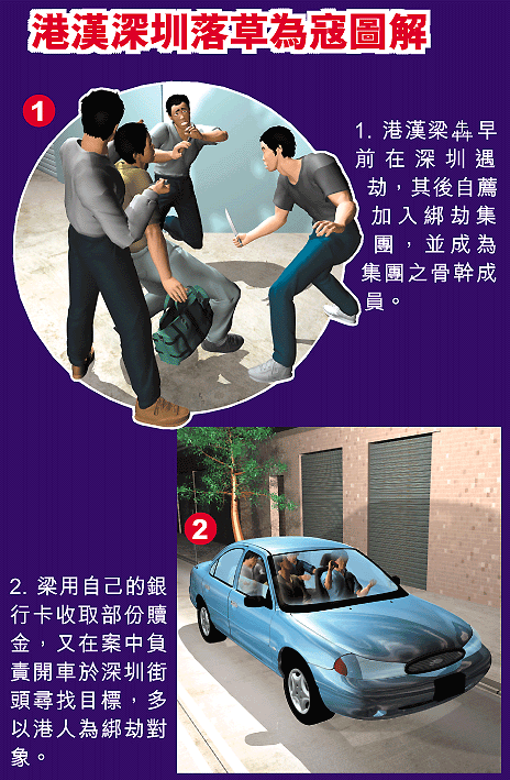 這個涉及二十九名被告的龐大綁劫集團,被控在○二年十月至○三年二月的半年內,在深圳至少犯案三十三宗,賊人通常分成「六人組」行劫,案中受害者多為北上的港人,賊人洗劫事主後會再向其家人勒索贖金,其中一名姓雷港人被綁劫後,共損失七十五萬元。