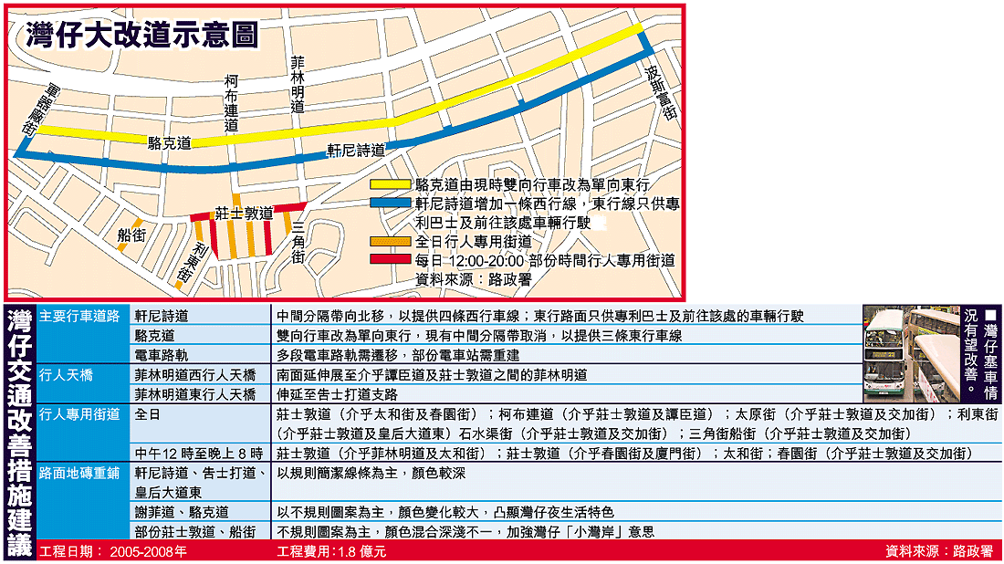 【本報訊】灣仔白天商業繁忙,晚間則夜夜笙歌。為了強化這個小灣岸的活力,路政署提出一項接近二億元的「變身」方案。政府建議在軒尼詩道及駱克道一帶實施順時針單向迴旋交通系統,以改善行車速度;在莊士敦道一帶設置行人專區,並重鋪多條道路地磚,以凸顯多姿多彩夜生活等地域特色。工程預算在明年動工,四年後呈現一個「新灣仔」。 記者:羅偉光、蔡元貴