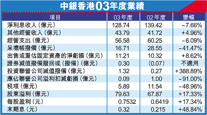 【本報訊】中銀香港(2388)受惠於稅務儲備回撥、一般準備回撥等一次過非經常性因素的幫助,抵銷了經營收入下跌的影響,去年純利上升17.33%,至79.63億元,遠超市場預期;期內該銀行資產質素明顯好轉,不履約貸款比率由前年底的7.99%降至5.78%。管理層相信,上述兩項一次性因素,以及去年度因物業重估減值而錄得的11.11億元虧損,都不會在今年度重現。