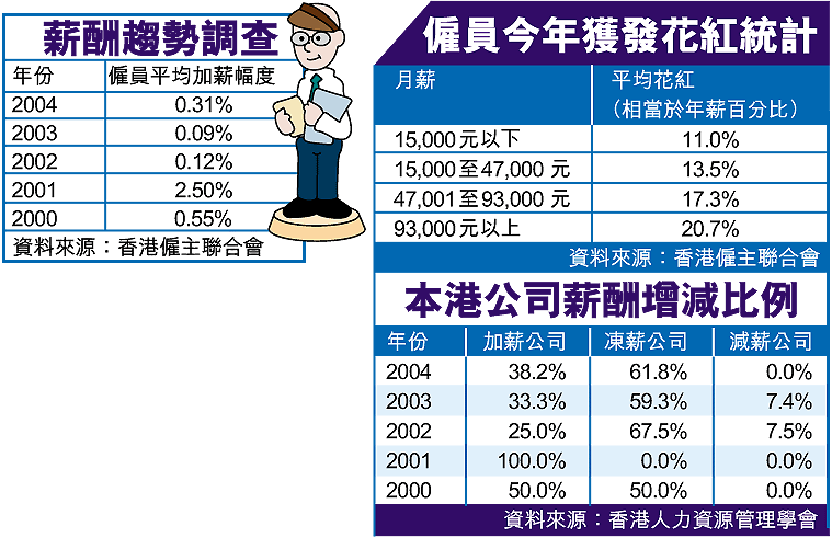香港僱主聯合會亦於日前完成了一項二○○四年的薪酬趨勢調查報告,調查涵蓋一百九十九家公司,共聘用約十二萬六千名僱員。當中一百二十八家公司已於今年一月或二月調整薪酬,平均薪酬增幅為百分之零點三一;餘下的七十一家公司則將於今年稍後調整薪酬,預料平均增幅將為百分之零點二四。
