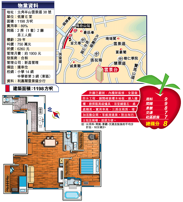 雲景台放盤向來不出數個,介紹的低層E室,裝修僅兩年,全屋設計典雅,業主罕有地割愛,是目前放盤中最優質的一個。廳房鋪砌紫檀木地板及地腳線,訂做胡桃木衣櫃,房間及廚廁更換胡桃木門,窗戶安裝捲簾,用料名貴。