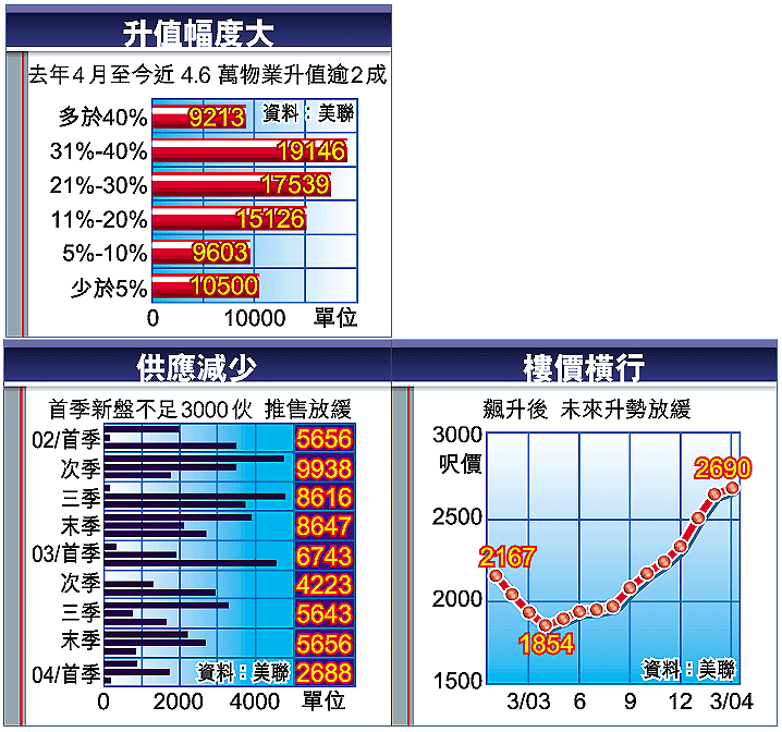 美聯物業資料研究部報告,首季一手成交估計可達9284宗,為98年第4季以來新高,二手則預計19819宗,屬97年第3季以後的新高。至於樓價,中小型住宅平均呎價,已由去年第4季的2337元,升至2690元,幅度達15.1%;豪宅升幅更大,由5587元升至7040元,勁升26%。