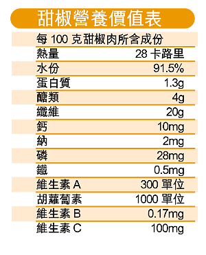 近年來隨着人們的飲食習慣改變,滿足口腹之慾外,亦關注如何從食物中獲得更豐富營養維持身體健康。甜椒本身屬低熱量食品,多吃也不怕胖,加上甜椒含有豐富的維他命A、B、C、醣類、纖維素、鈣、磷、鐵等營養素,同時亦是各類蔬菜中維他命A和C含量最高的,所以廣受健康一族歡迎。完全成熟的甜椒,其營養價值更會激增五倍,因此購買時不妨選擇較成熟的甜椒。