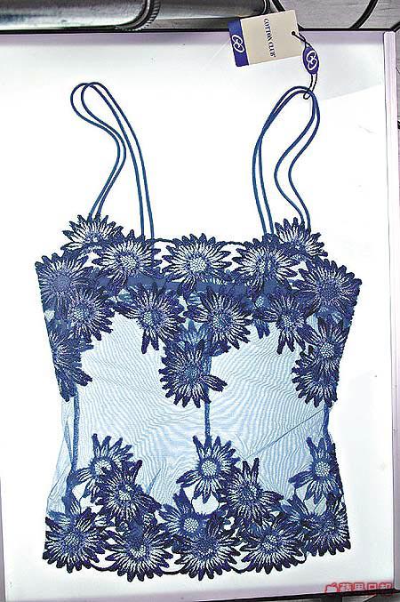 CottonClub藍色繡花喱士背心,喱士質地非常輕軟舒適,而花花就以不同顏色線繡成,增添了不少立體感。