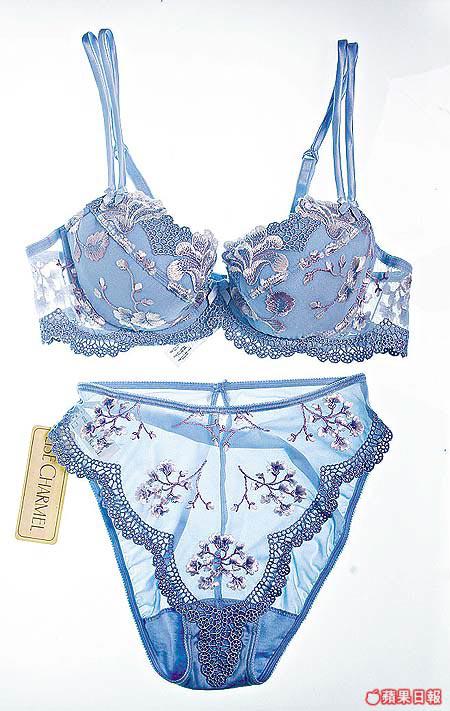 LiseCharmel粉藍色繡花款,內層備有活動胸墊,透視款內褲的波浪花邊比較少見,而且用料柔軟滑身,手感很好。