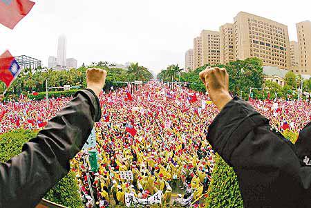 大集會安排在下午二時開始,其實早在中午已經揭開序幕了,總統府前的凱達格蘭大道早已擠得水洩不通,遲來的人只能在圍繞着民主廣場的公園路、中山南路和仁愛路站着搖旗吶喊。綿綿雨點下,與民主廣場上的民眾互相呼應,聲勢澎湃。這一天,好像整個台北市都在躁動。