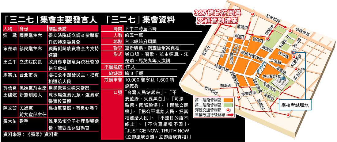 這天有很多年輕人上街,他們沒有中年示威者的激情,卻為「三二七」帶來更多民主活力。二十七歲的電腦工程師蔡先生沒有擠進廣場,只在看不見總統府的公園路上遙遙感受這趟大事。大會口號是「要真相,拚公道,救民主」。蔡先生說台灣還有民主,不用救,人們還有言論和集會的自由,他只是不滿執政者把選舉搞成這個模樣,「我怕陳水扁再做四年,他會變成希特拉」。