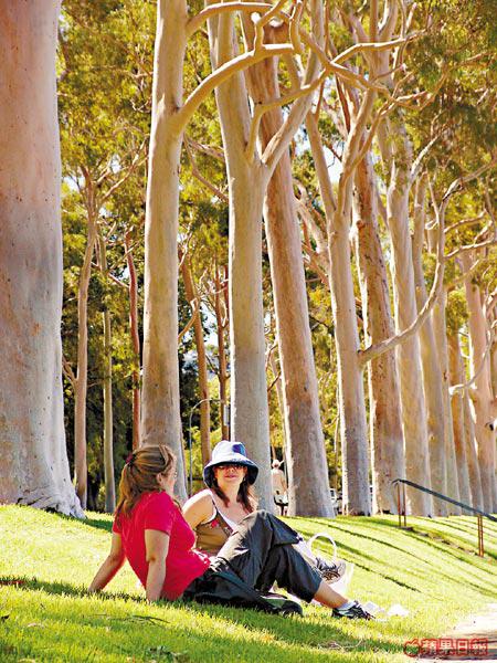 珀斯的英皇公園(King'sPark)佔地四百公頃,坐擁全市最美最佳的景觀,馬來西亞籍導遊說:「換轉在亞洲的大城市,恐怕這裏早已變成高尚住宅區了。」幸好是珀斯,所以,英皇公園不僅「生存」下來,還愈來愈原始,要不是前方的鬧市風光,真的有如走進原野森林。說它是珀斯市中心的國家公園,似乎也更加貼切。在這個布局像原野山林的公園內,就已種滿了12,000種野生花卉,當9月時分春回大地的時候,這裏就變成七彩繽紛的花花世界,美得要命。現在,時近深秋,盛開的野花已所餘無幾,但漫步林蔭下,仍是引人入勝。一大片一大片廣闊無邊的草地坐滿了來散步來野餐來躲懶來觀光的人,我也恨不得拿出紅酒,就此跟良朋碰杯。不過,我的時間卻太緊迫了,還是把握每分每秒,好好欣賞這個公園的每一棵植物吧!