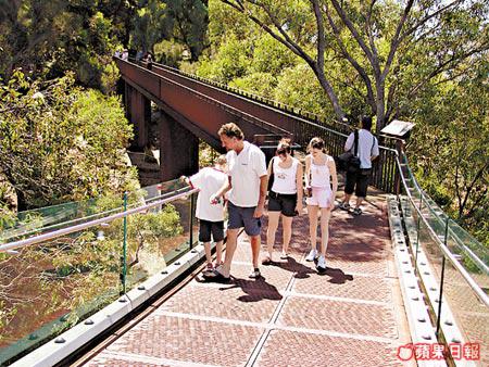 我先由最新落成、花了3.6百萬澳元的LotterywestFederationWalkway開始遊花園,這條長達52米的鋼橋穿梭於百棵巨樹之間,在橋上走感覺就像奔跑於熱帶森林的吊橋間,只是,每走一步,左方是綠油油的森林,右方卻是湛藍一片的海洋和高高低低不同色調的房屋,偶然再點上幾艘帆船,吹來清爽海風,從容不迫地,這樣的心情真的是超爽!