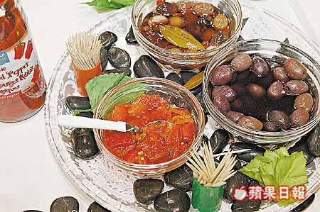 橄欖、辣椒等是西方人用餐時喜歡添加的配料,現場出售整瓶醃漬過的辣椒及橄欖,全屬天然健康食品,不添加防腐劑。