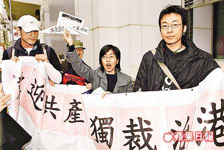 另一批民主派人士昨日率先採取抗議行動,數名「七一人民批」成員手持「歡迎共產黨獨裁治港」的橫額到中聯辦示威,他們放出寫有「港人治港」、「高度自治」的紙飛機,諷刺北京不守承諾「放香港人飛機」。民主黨、前綫及學聯今日亦分別有抗議行動,到政府總部及中聯辦表達不滿。