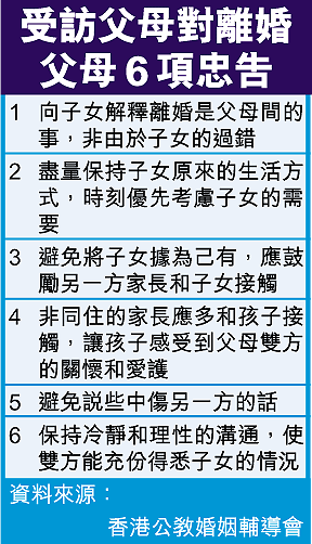 【本報訊】離婚在香港已是一個普遍的社會現象,子女也成為最容易受傷的一群,但一項研究顯示,離婚夫妻也可以做好爸爸和好媽媽,只要時刻優先考慮子女需要;不同住的一方多和孩子接觸,讓子女感受父母關懷,離婚對子女造成的傷害可以減至最低。