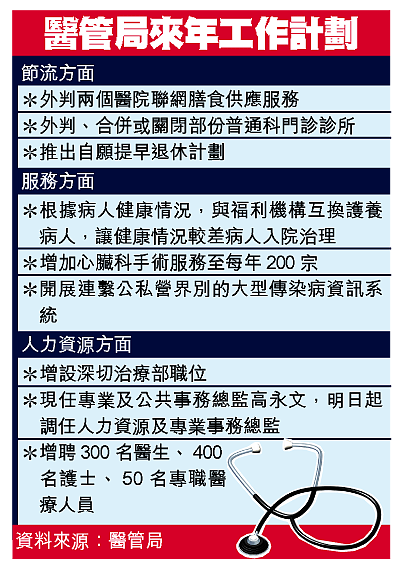 醫管局又將在膳食供應上開拓公私營合作計劃,邀請私人機構為新界西及九龍中兩個醫院聯網提供膳食,佔所有醫院膳食的三分之一。計劃開展後,醫管局將不再招聘負責膳食服務的人員,而這批人員將是下一輪自願提早退休計劃的對象。