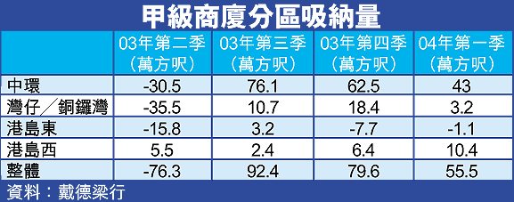 現時中環呎租約25元,較去年第四季漲9%,灣仔銅鑼灣每呎17元,升13%,港島東區呎租約13元,上升8%,尖沙嘴區呎租15元,有7%升幅。