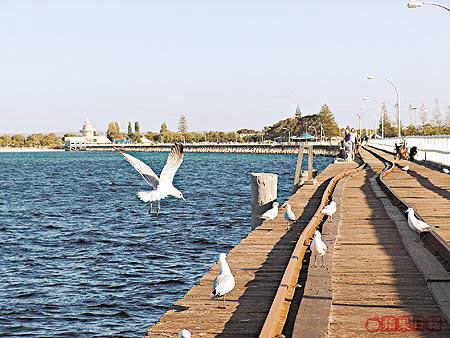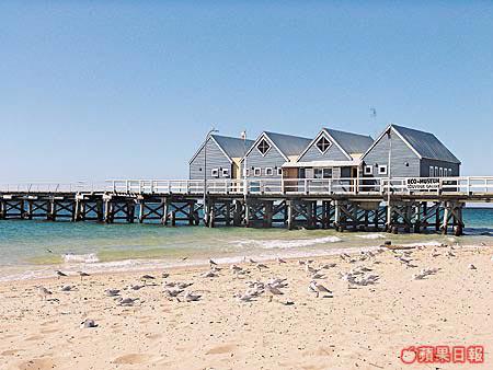 經過多次修葺的BusseltonJetty,佇立於GeographeBay之上,一列淡藍的木房子配上白如雪的海堤,還有海天一色的風光,單是沐浴在這幅美如明信片的畫面中,已叫我神魂顛倒了。我甚至願意只呆在沙灘上,一直沉醉在這幅懾人的圖畫內就心滿意足。
