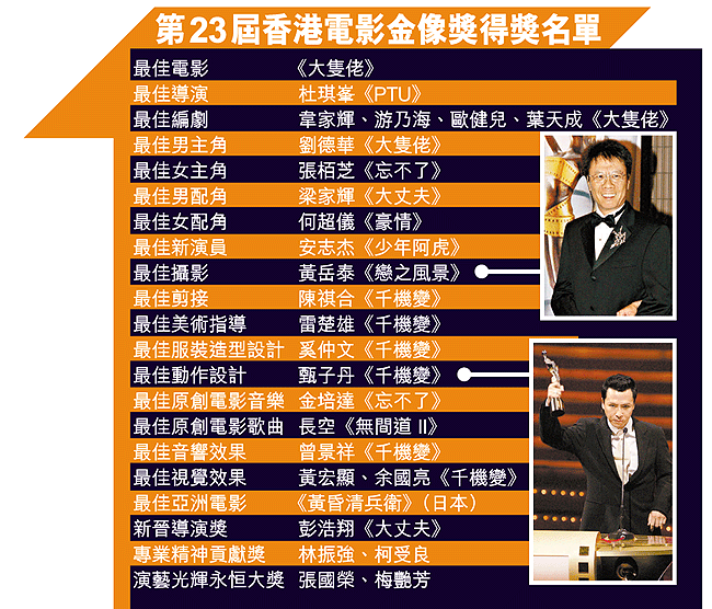 【本報訊】今屆香港電影金像獎頒獎禮,劉德華和張栢芝以大熱姿態奪得「最佳男、女主角」,華仔乃第二次封帝,而栢芝更以二十三歲之齡奪影后榮譽。栢芝表示自己入行六年,有四年在片廠度過,可見她為電影亦付出不少。二人合演的《大隻佬》亦奪得「最佳電影」,而《千機變》則奪得六個獎項成為大贏家。 記者:何永寧、陳月萍