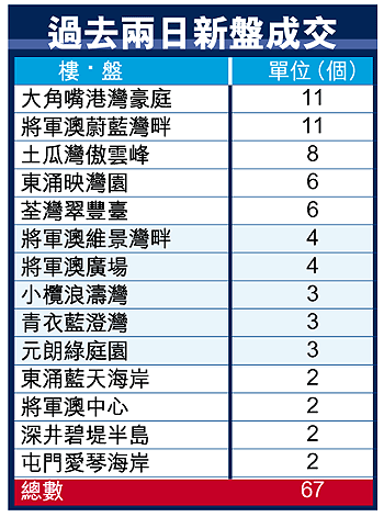 過去兩日售出的一手新盤,主要位於將軍澳及西九龍,合共錄得40多宗成交,佔整體六成,但銷量大部份不及前周,以大角嘴港灣豪庭為例,市場消息表示,周六日約售出11伙,較上一周大減82%,樓盤5座高層G室,729呎,以290萬元成交,每呎3978元,買家為韓國人。長江實業(001)、新世界發展(017)等合作的土瓜灣傲雲峰,成交量亦減少80%,前周有40宗,本周僅得8宗。