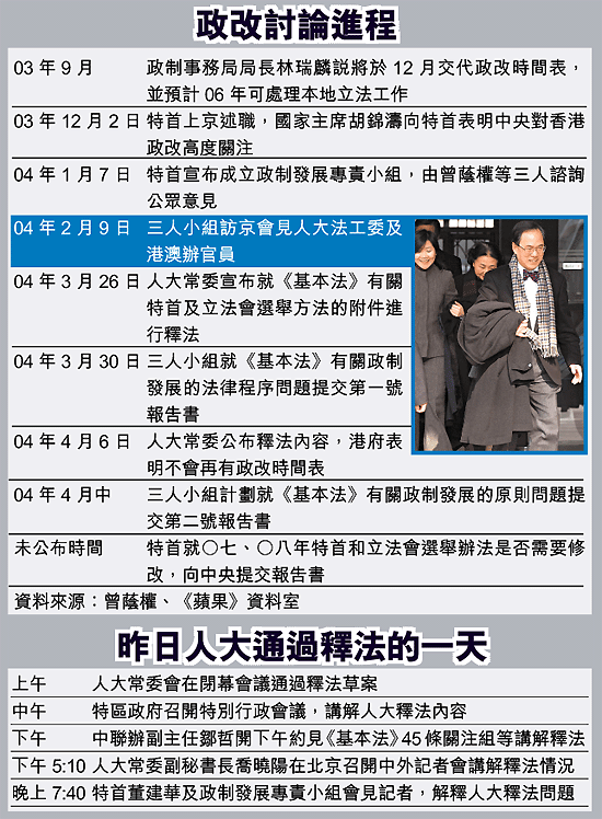 特首董建華昨日連同曾蔭權、律政司司長梁愛詩和政制事務局局長林瑞麟召開記者會。董建華先表明支持釋法,指這為政改討論提供了「最權威的法律依據」,也為政府下一步工作提供「最堅實的法律基礎」。