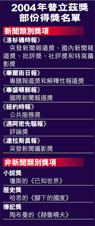 二○○三年是美國新聞業黑暗一年,作假醜聞屢出,對伊拉克戰爭的報道被批評過於親政府。就在這片黑暗的氛圍中,本年度美國新聞出版最高榮譽普立茲獎獎落誰家份外矚目。獎項周一揭曉,結果去年爆出記者作假報道的《紐約時報》風光不再,只拿得一獎;是全年新聞焦點的伊拉克戰爭,只帶來兩個獎項;《洛杉磯時報》成為大贏家,一口氣奪得五個新聞獎。