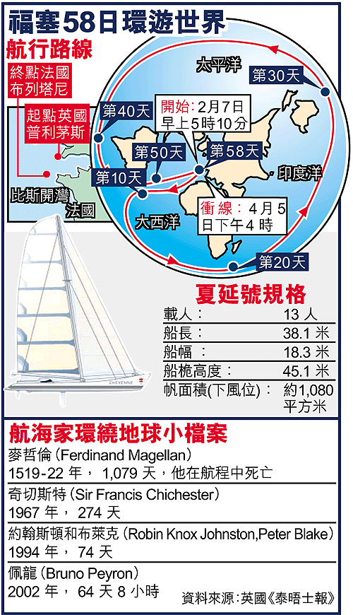 福塞與十二名船員駕駛長三十八米的「夏延」號(Cheyenne)雙體船,周一在法國布列塔尼衝線,以五十八天九小時三十二分零四十五秒環遊世界一周,比法國冒險家佩龍(BrunoPeyron)在○二年所造的舊紀錄快五天二十三小時四分零三十九秒,更創下他第二十二項帆船紀錄。福塞二月七日由英國普利茅斯出發。