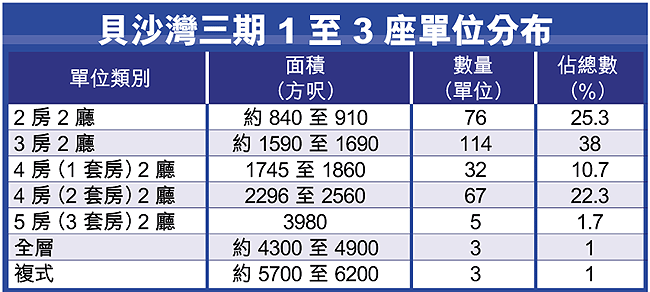 發展商昨天公布南灣單位分布,其中1590至1690方呎3房單位佔38%,另兩類4房單位,由1745至2560方呎,佔33%,換樓客成目主要銷售對象。