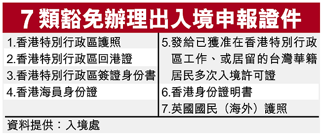韋泉補充,為提高出入境效率,入境處除增派一百八十人進駐各口岸,亦由今日起簡化本港市民出入境手續,凡持有身份證等七類人士(見表),出入境時毋須再填寫及提交旅客抵港或離港申報表,相信此舉可大大提高出入境效率。至於四大出入境口岸中,唯一與鐵路接駁及有較多櫃枱的羅湖口岸,相信在未來數日會有較多市民使用進出境,將成為最繁忙邊境口岸。