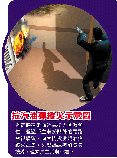 事後事主翻看裝在門外的閉路電視錄影帶,發現拍攝到有人從走廊近電梯大堂轉角位遠處拋出一個玻璃樽,然後「蓬」聲起火,但因角度問題未能拍到兇徒樣貌,只影到一隻手,惟黃婦仍懷疑事件與樓下一名年約三十歲的男街坊有關,警員接報落樓但發現重門深鎖,整日都未能聯絡上該名男街坊。