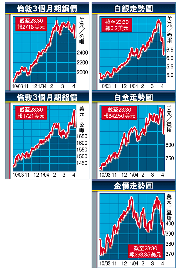 LME的3個月期銅昨日一度再跌36美元(1.33%),見每公噸2678美元,是2月13日以來低位;3個月期鋁跌17美元(1%),報每公噸1703美元。期鎳跌見4個月新低。