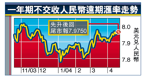 郭氏雖未透露任何變動的時間表,但交易員隨即借人民幣升值的憧憬進行炒作,1年期美元兌人民幣折讓差價,一度由3080點子,擴闊至3480點子。要勞駕中國外管局官員昨午澄清,中國不會在短期內改變滙率政策,人民幣遠期折讓價才應聲收窄。