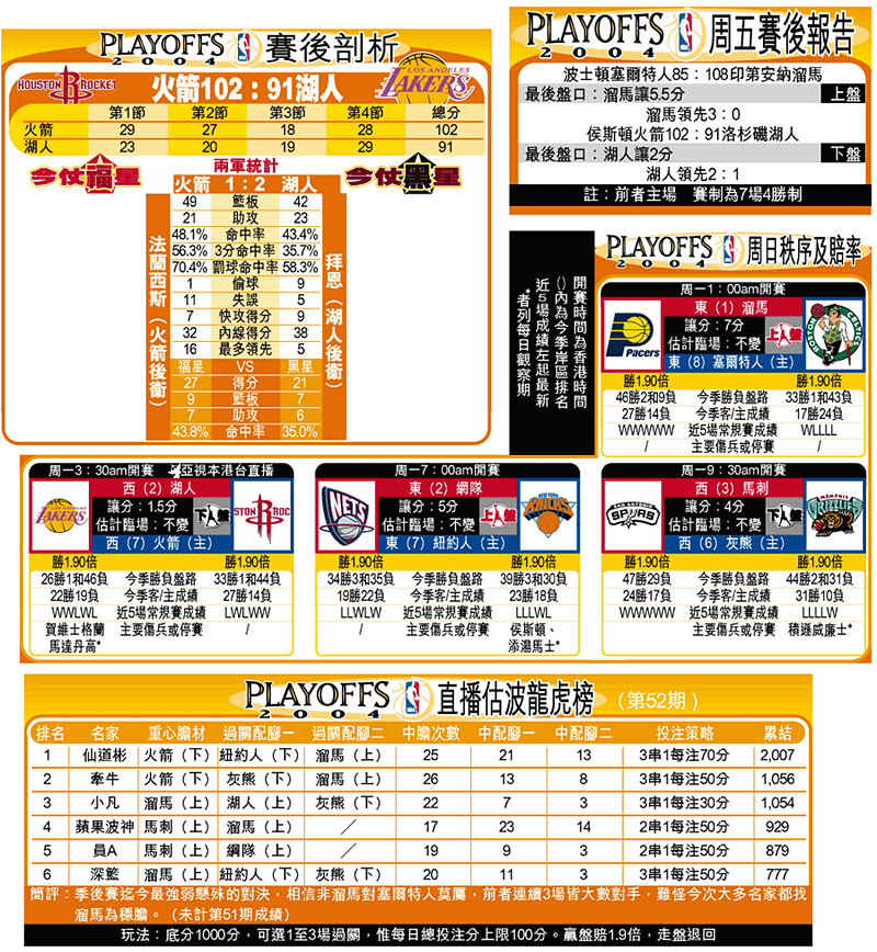 欲破湖人,必先制「孖寶」!火箭上周五在主場迎戰湖人的第三戰中,成功凍結拜恩的命中率只得三成半,加上以夾擊戰術令奧尼爾在比賽中段「消失」了二十四分鐘;火箭卒以一百零二比九十一打響勝鼓,亦令姚明首嘗季後賽勝利滋味。第四戰將於周日續於火箭主場上演,料火箭仍受讓下可添食。(亞視本港台明日3:30am直播)深籃