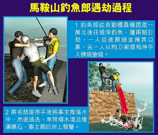 【本報訊】一名戴鴨舌帽的釣魚郎,昨晨在馬鞍山銀行自動櫃員機提款一萬元,稍後準備到銀行入數繳交供樓款項和雜費,但發現銀行未到營業時間,便往鞍駿街堤岸釣魚消遣,突然被兩名賊人箍頸掩口,搶去褲袋內現金後將他推落海逃去;幸現場堆滿礁石和淺水,遇劫事主半身濺濕爬上岸報警。 記者:文兆麟