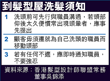 香港髮型設計師聯盟常務理事吳錦添認為,現時本港髮型屋的洗頭設施已能做到既舒適又安全,由於洗髮椅的高度略低於洗髮盆安裝的位置,故顧客躺在椅上洗髮時,頭部只需輕微往後仰,便可以完成整個洗髮程序。 本身開設髮型屋的吳錦添說,部份髮型屋近年更引入可以調校斜度的洗髮椅,讓顧客「坐喺度洗頭」。他提醒光顧髮廊的人士,坐在洗髮椅上洗髮時,應保持一個令自己舒適的姿勢,不用遷就髮廊的員工,若感到不適,應立即告訴對方。 本報記者