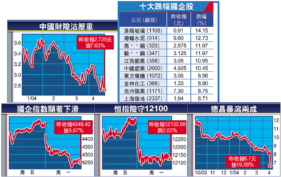 中央嚴控經濟過熱,收緊銀根,持續影響國企股的投資氣氛,國企指數昨日再跌5.67%,收報4248點,成為今年新低。