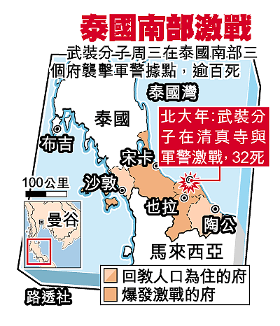 泰國南部周三爆發歷來最血腥的戰鬥。三個府的十五個軍警據點疑遭回教武裝分子攻擊,雙方激戰八小時,一百零七名武裝分子被剿滅,大部份是青年,軍警僅有五人喪生。總理他信指今次一役後,南部的分離主義活動再難有作為。