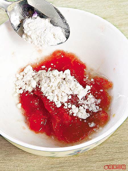 先將番茄去皮,然後磨成茸或用攪拌器攪成糊狀,加入麫粉及檸檬汁混合成糊狀,敷上面約10分鐘後以清水洗淨便可。