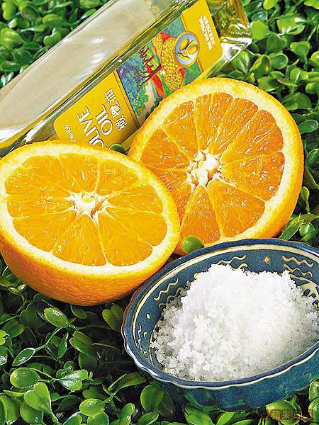 橙皮含維他命C及有磨砂作用,粗鹽則是天然磨砂材料,加埋可滋潤皮膚的橄欖油,將混合物直接在手踭、膝蓋及腳踝等容易偏黑的位置摩擦,便可美白兼去死皮。