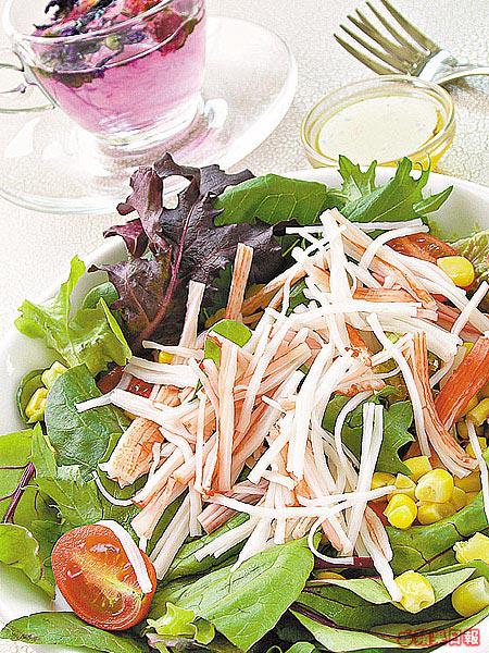 同是選用飛機運來的沙律菜,但重點就是蟹柳,可以補充五行中的水。而且對人緣有幫助,對經常接觸不同類型人士的工作有幫助,間接旺事業。