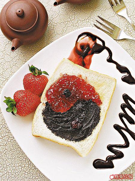 多士上的太極圖形,黑色是黑芝麻醬,紅色則是草莓醬。兩者除了可幫助欠木和火的元素外,更加可以凸顯男性更man及女性更溫柔的一面。