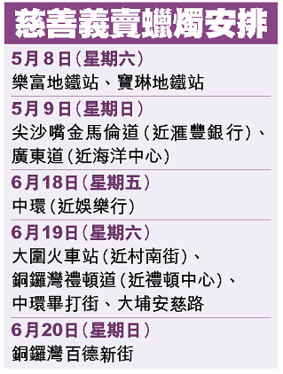 是次活動已踏入第五年,今年推出的兩款全新公公婆婆造型蠟燭,分別為「福有攸歸版」及「壽比南山版」,每款慈善價20元,一套兩款則以優惠價38元發售,於即日起在全港多處地方進行義賣(詳情見表)。