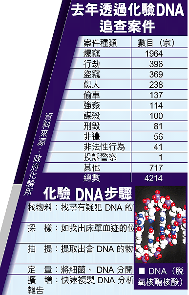 政府化驗所去年共化驗了四千多個DNA樣本,較○二年增加一倍。爆竊、偷車、刑毀案的DNA化驗不斷增加。黃達民更透露,DNA技術曾協助警方偵破街頭騙案、販毒、傷人、搶劫、非法墮胎、偷錢、高空擲物等案件。「試過有跌錢黨將贓錢收喺賓館,有啲寶藥黨用海燕之類嘅藥呃人,警察畀啲錢同藥我哋驗,睇吓有冇疑犯嘅DNA。」