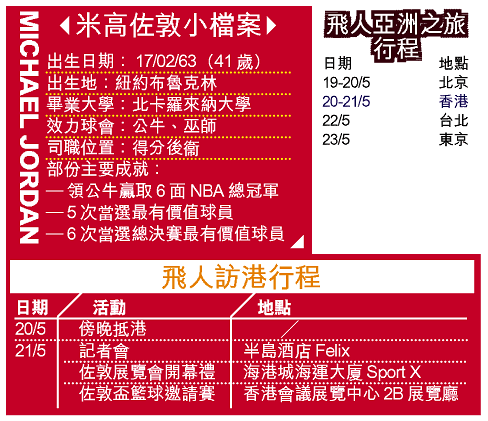 早前宣布會於今夏作亞洲之行的飛人佐敦,終於在昨日落實其行程。他先會在五月十九日抵達○八年奧運主辦地點北京,之後訪問地區依次為香港、台北和東京。這次是佐敦自九七年隨公牛到日本作表演賽後,再次到訪亞洲。