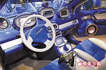 Alpine去年為慶祝成立25周年而製作的改裝本田思域房車,車內裝上27款影音系統及喇叭設備,屏幕更可接駁電子遊戲機(圖),要製作相同的高級流動影院需花費200萬港元。
