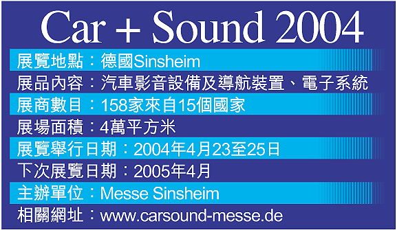 全球最大的汽車電子設備展「Car+Sound」已有10年歷史,產品發展方向一如家庭電器市場:各家歐美及亞洲汽車設備製造商的最新產品,全是一站式控制的多功能電子系統,因此各類多媒體娛樂器材及駕駛指示儀器能融合及使用,讓車主能將汽車提升為擁有高級享受的流動影院及音樂廳。