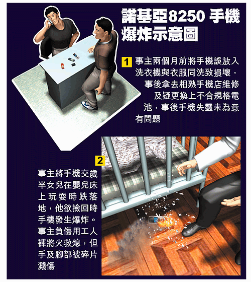【本報訊】元朗一名現役文職警員兩度將有故障的諾基亞(NOKIA)8250手機拿往維修後,手機疑更換了不合規格電池而不知,事主昨晨將手機交歲半女兒玩耍時,手機不慎墮地及突然爆炸「解體」着火,他不及閃避手腳當場被碎片濺傷,幸女兒未有受傷。火勢瞬即被救熄,報警後他獲送院治療。消防員事後將手機殘骸撿走交機電工程署化驗爆炸原因。這是本港一個月內發生的第二宗諾基亞手機爆炸意外。 記者:區恩傑 黃學潤